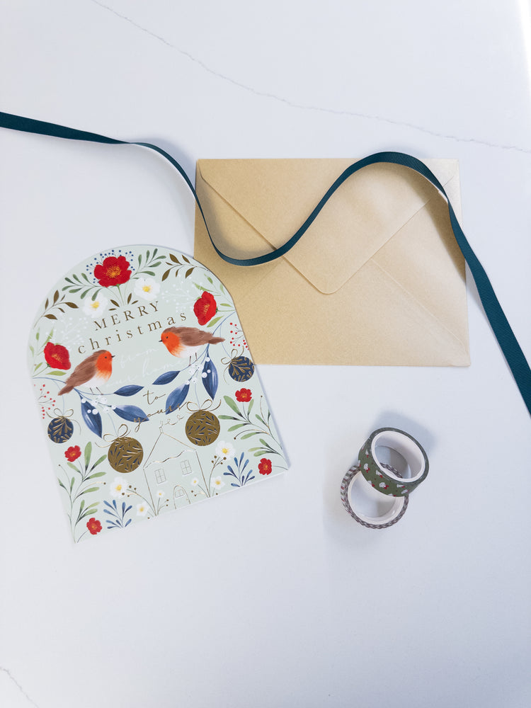 Δύο κοκκινολαίμηδες φωλιάζουν ανάμεσα σε γιορτινά άνθη και φέρνουν μαζί τους ένα μήνυμα γεμάτο ζεστασιά. Οι απαλές πράσινες αποχρώσεις και οι χρυσές λεπτομέρειες κάνουν αυτή την κάρτα να μοιάζει με μια γιορτινή ευχή κατευθείαν από το σπίτι.